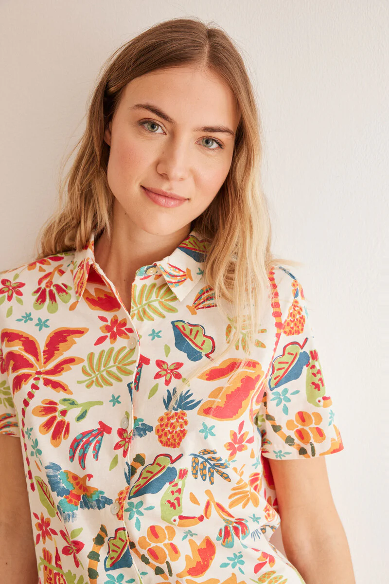 Classic 100% cotton pyjamas with short sleeves and shorts in a tropical allover print. Super comfy and ideal for bedtime or lounging at home in style.