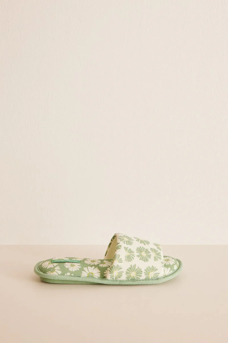 Slider-style slippers with wide strap and green floral print. Perfect for looking good and staying comfy around the house.