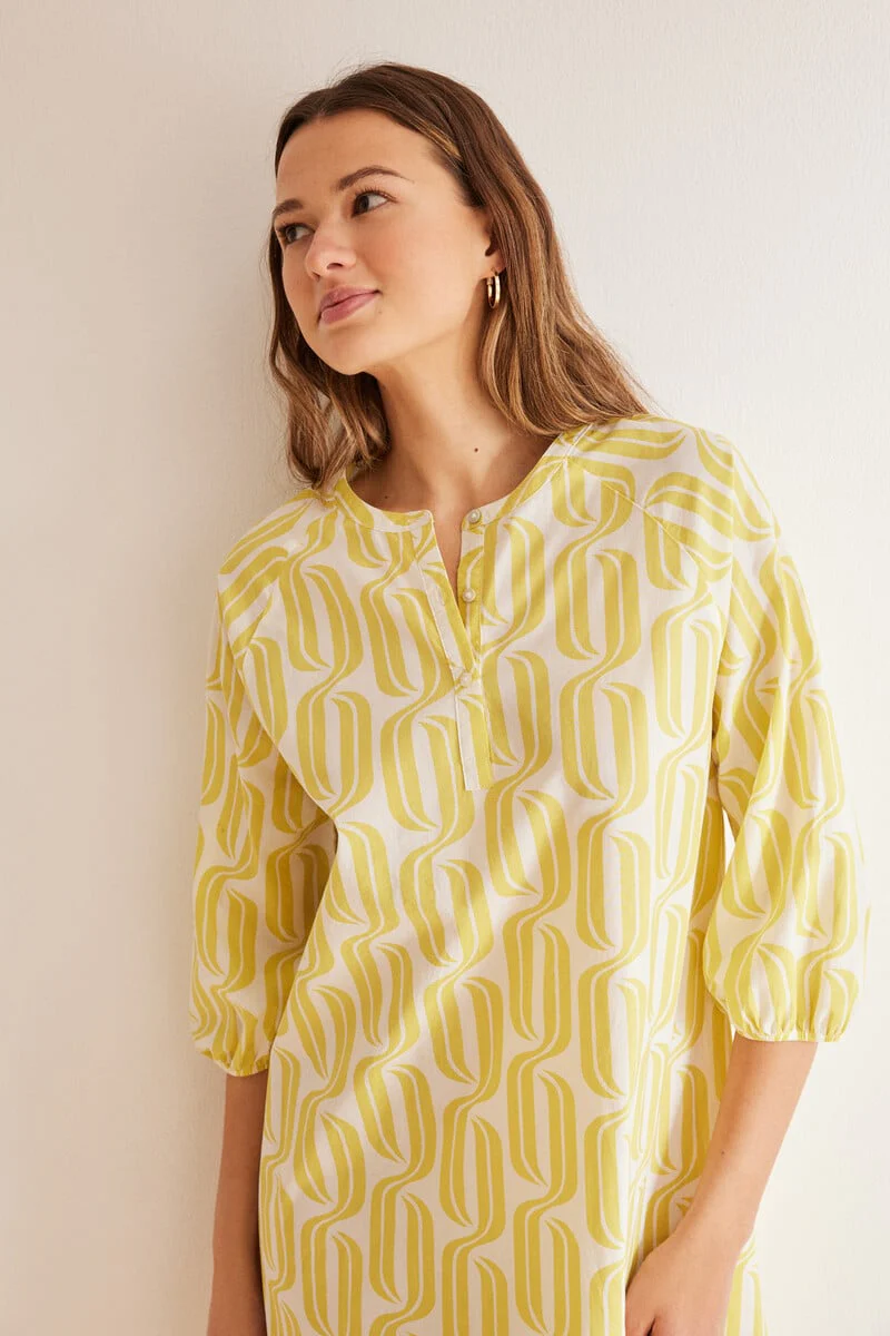 Midi camisole with an all-over geometric print in yellow tones, made in cotton.